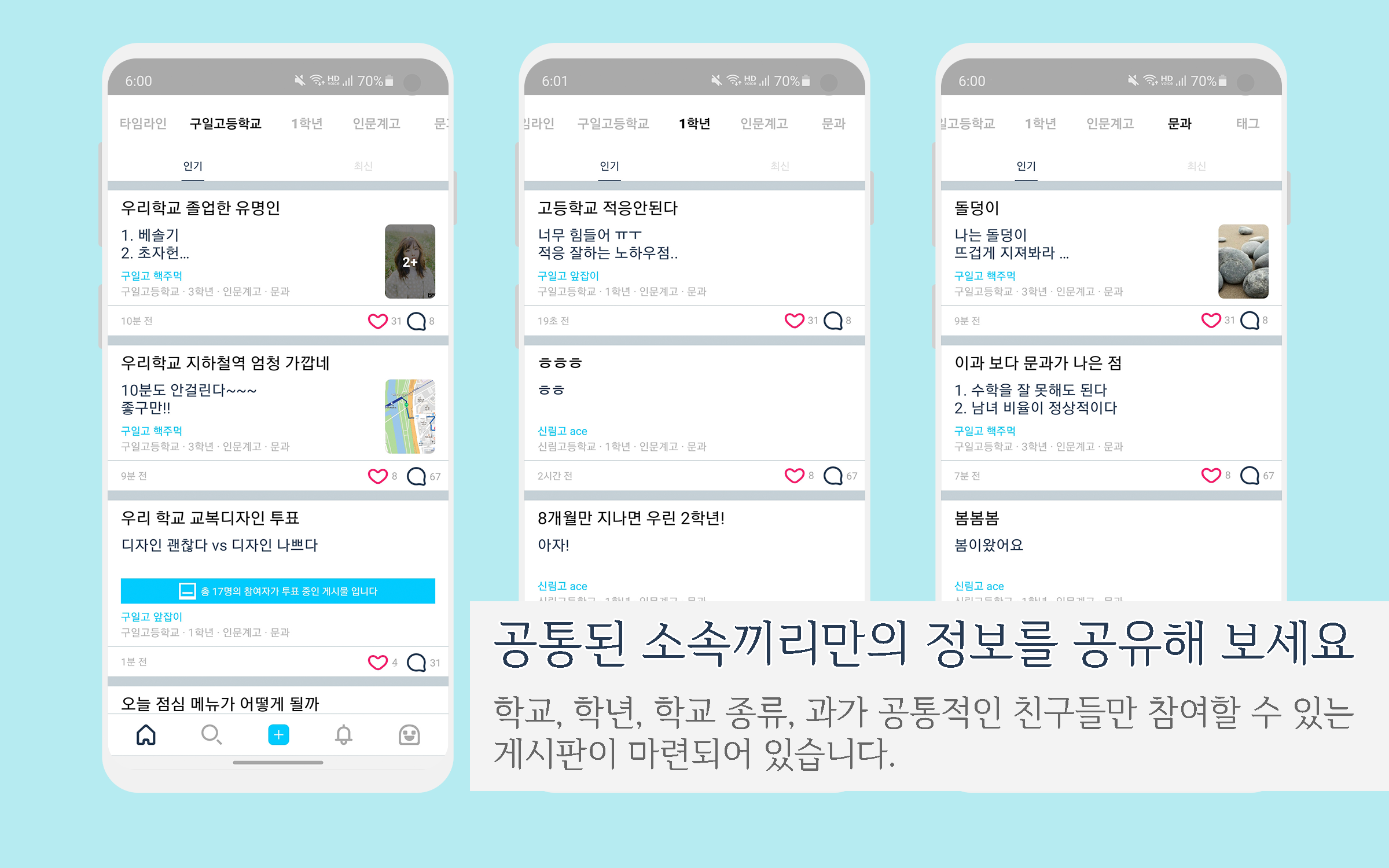 학교별로, 학년별로, 공통점별로 소통하세요. 전국 고등학생 익명 커뮤니티 : 급식판 1. 소속된 친구들과 함께 하세요 학교, 학년, 학교 종류, 과를 가입 과정에서 선택할 수 있습니다. 다음 정보들은 추후 커뮤니티 활동에서 사용하게 됩니다. 2.공통 소속끼리만의 정보를 공유해 보세요 학교, 학년, 학교 종류, 과가 공통적인 친구들만 참여할 수 있는 게시판이 마련되어 있습니다. 같은 학교 학생들끼리 해당 학교의 정보를 공유하거나 학년, 과 등 공통된 친구들