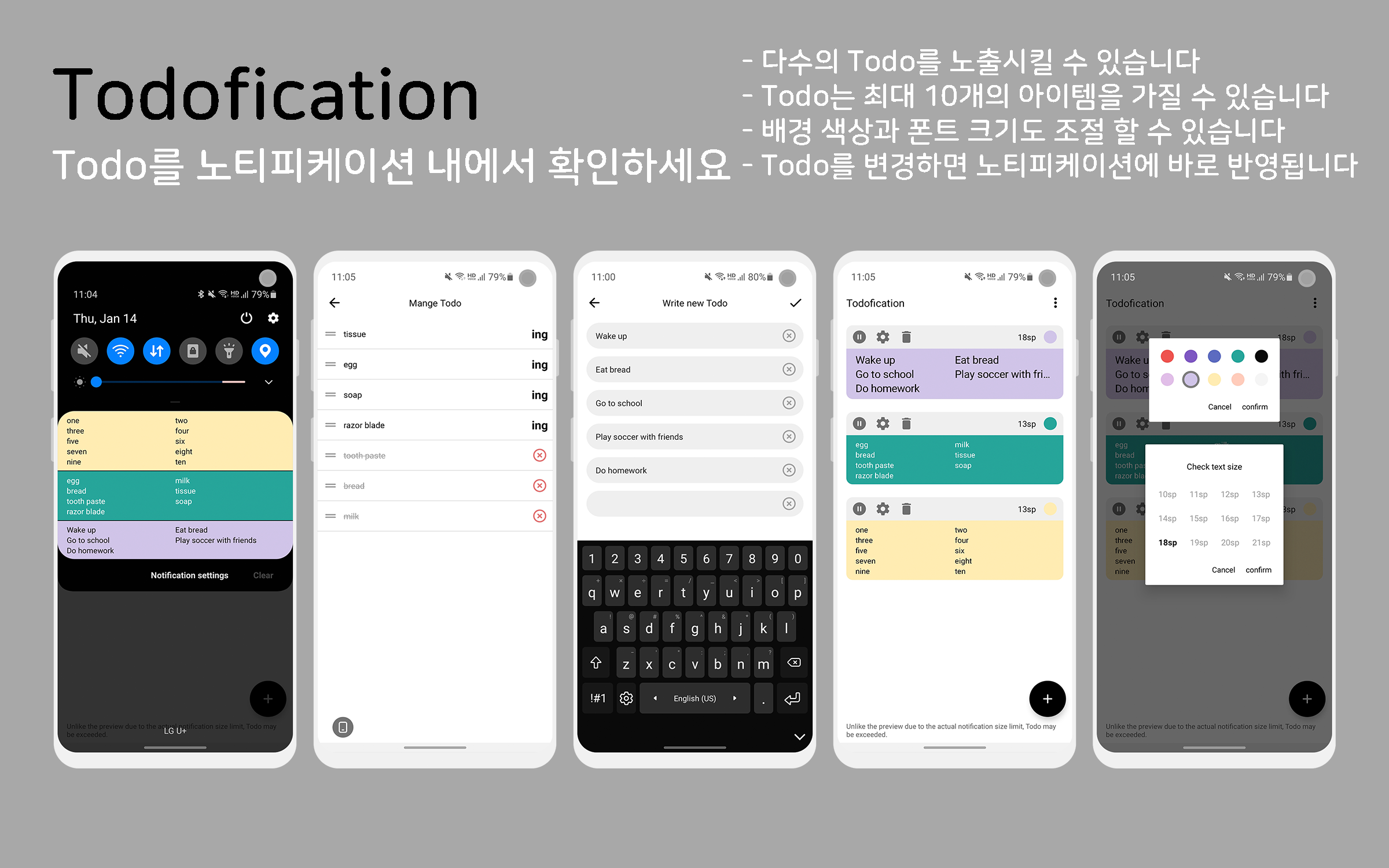 Todo를 노티피케이션 내에서 확인하고 관리하세요. - 다수의 Todo를 노출시킬 수 있습니다 - Todo는 최대 10개의 아이템을 가질 수 있습니다 - 배경 색상과 폰트 크기도 조절 할 수 있습니다 - Todo를