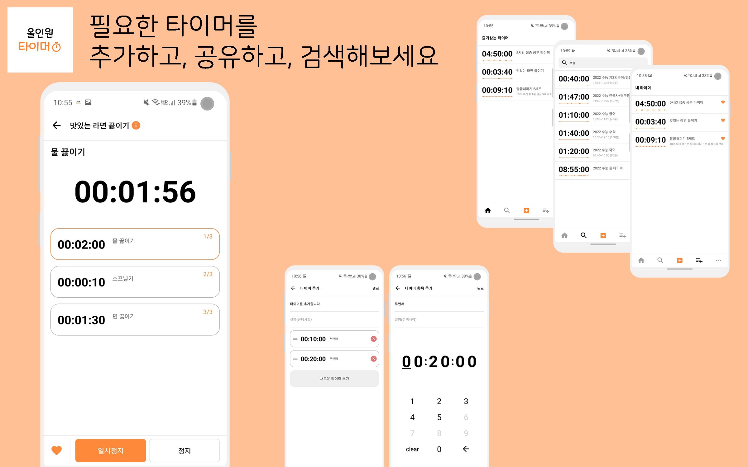 올인원 타이머 : 필요한 타이머를 추가하고, 공유하고, 검색해보세요. 나만의 타이머를 만들어보세요 : 타이머를 추가 버튼을 누르고 제목, 내용을 입력하고 타이머에 포함 될 시간과 시간정보