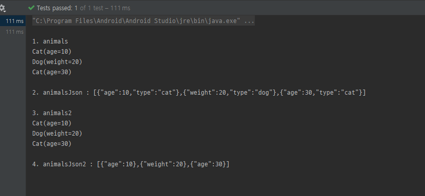 코틀린과 마찬가지로, RuntimeTypeAdapterFactory 생성시에 상위클래스 타입 추가인자에 ("type")값을 하위클래스 타입 추가인자에 ("cat","dog")값을 넣어줘야 한다.