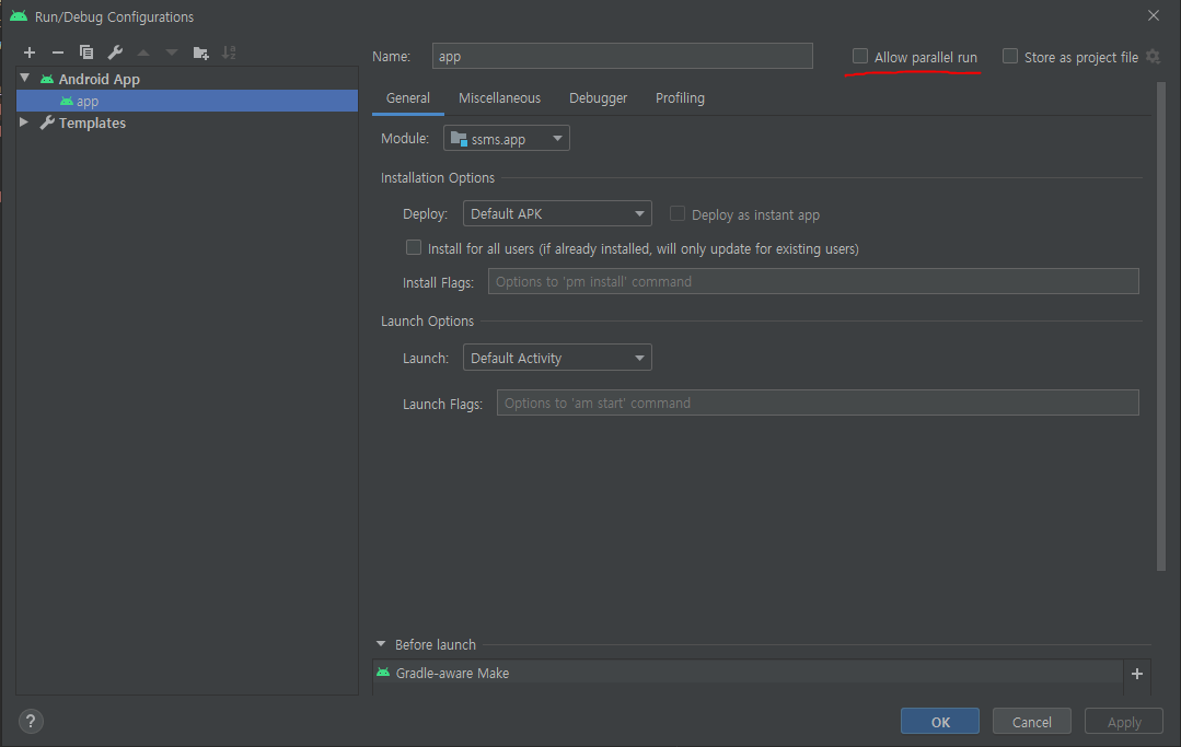 1. Run/Debug Configurations 에서 Allow parallel run 체크 해제