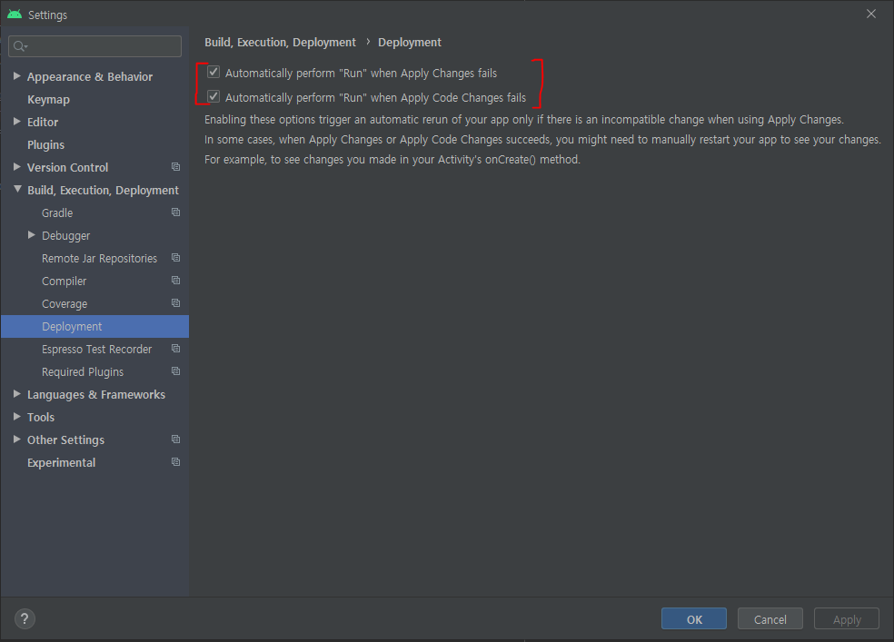 2. Settings - Build, Execution, Deployment - Deployment 에서 다음 두 사항 체크