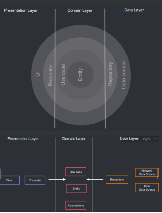앱에서 행해지는 비지니스 로직을 UseCase라는 구성으로 제공하며 비지니스 로직을 위한 Repository의 내부 실 구현은 데이터계층으로 위임하고, 비지니스 로직이 구현된 UseCase 자체는 프레젠터에 전달됩니다.