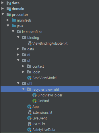 | - 뷰,뷰모델을 위한 유틸성 클래스들 - 프레젠터계층용 data - di 구성요소 - 뷰, 뷰모델 |